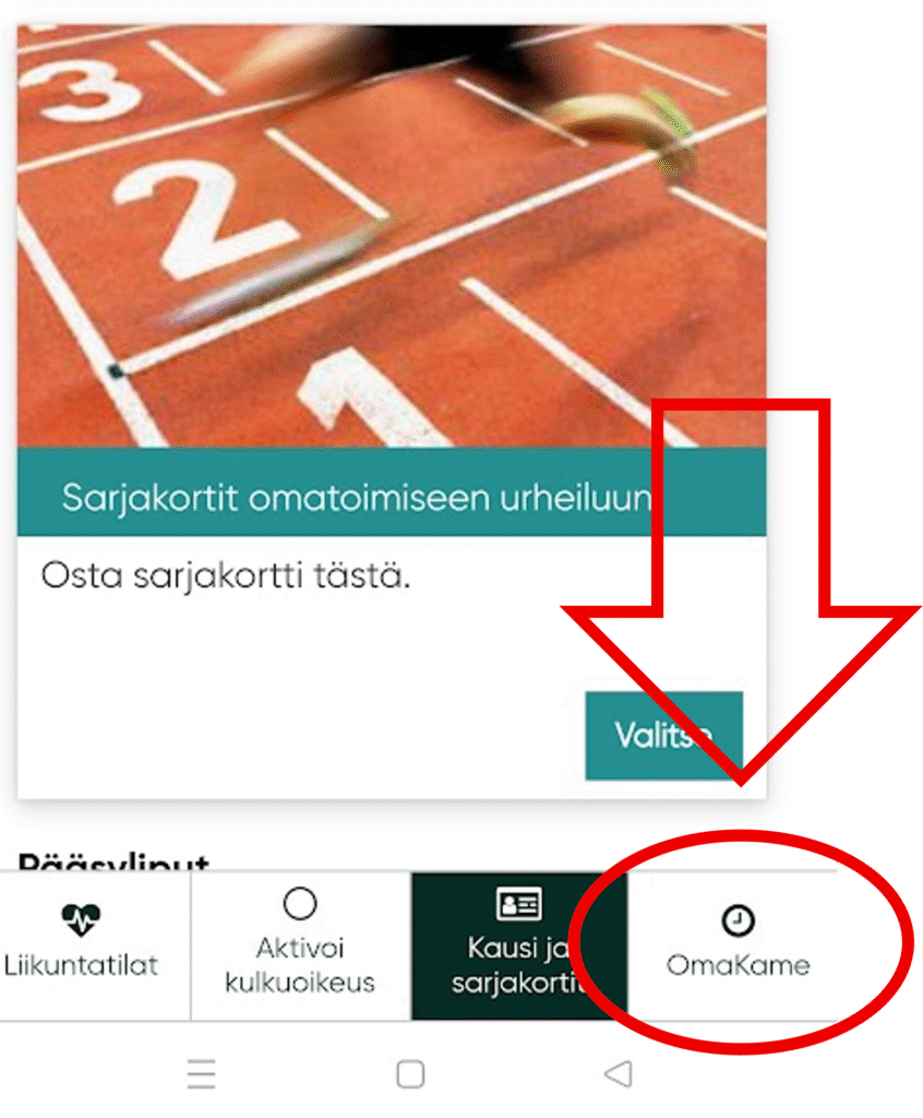 Kännykästä OmaKame löytyy kun siirryt kotisivulta eteenpäin joko ”Osta Lippu” tai ”Varauskalenteri” kohtaan. Näytön oikeasta alakulmasta löydät tällöin ”OmaKame”.